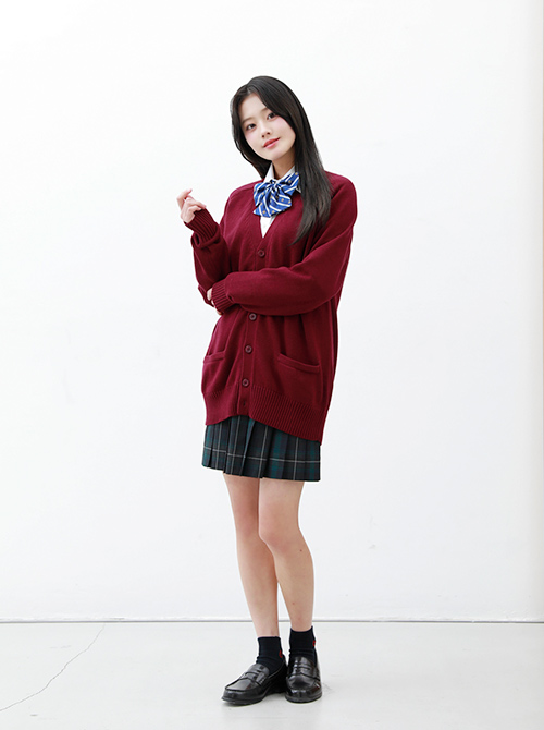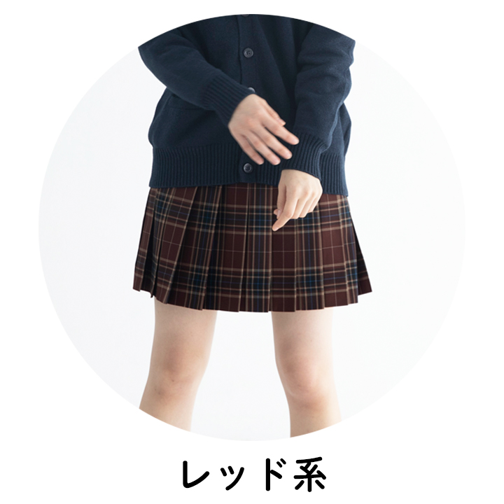 レッドやワインなどの赤みカラーを使ったコーデはとっても華やか♪スカートが目を惹く色なので、トップスはネイビーやブラウンなどの落ち着いたカラーを持ってくるとバランス◎赤系の色やオレンジはハロウィンを連想するカラーなので、学校生活以外での制服コーデにも大活躍!制服ディズニーや制服ユニバでのコーデにもおすすめです!!
