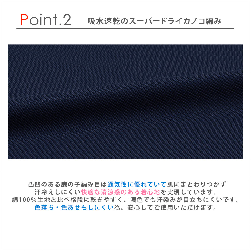 凸凹のある鹿の子編みになっているため、通気性に優れていて、肌にまとわりつかず、汗冷えしにくい。快適な清涼感のある着心地を実現しています。綿100%生地と比較して格段に乾きやすいため、濃色でも汗染みが目立ちにくい!また、色落ち・色あせもしにくいため、お手入れも安心してご使用いただけます。