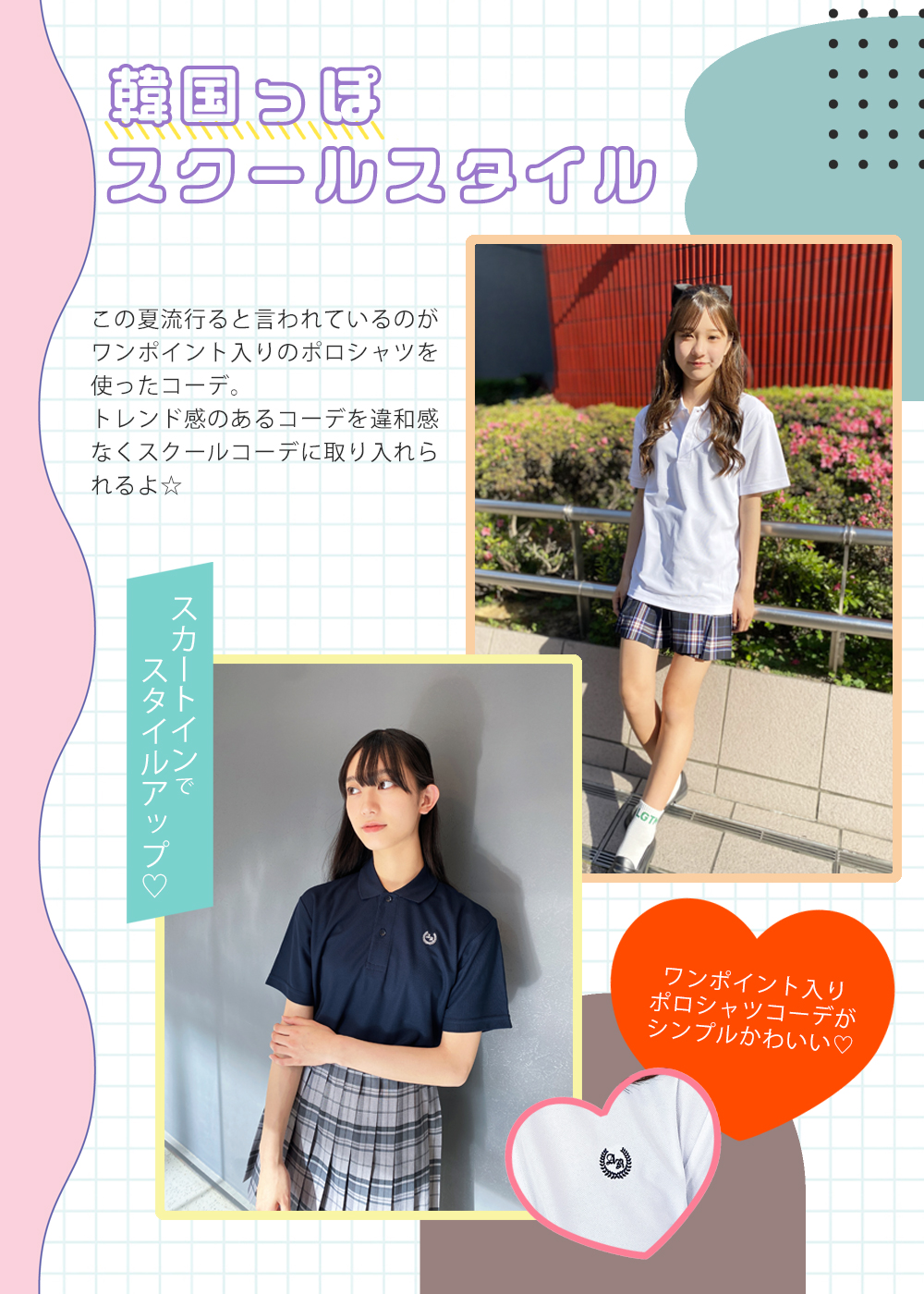 この夏流行るといわれているのがワンポイント入りのポロシャツを使ったコーデ。トレンド感のあるコーデを違和感なくスクールコーデに取り入れられるよ☆スカートにインすればスタイルUPも♪韓国テイストが好きなコはぜひ取り入れてみてね。